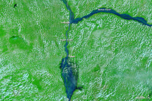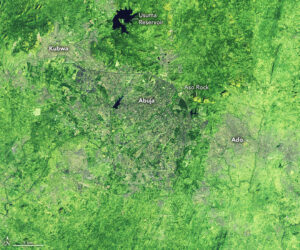 The Landsat 7 and Landsat 8 satellites captured these false-color images (bands 7-6-4) of the city in 2001 and 2021. This combination of shortwave infrared and red light makes it easier to distinguish developed areas (gray) from the surrounding grasslands (light green), forests (dark green), and farmland/bare land (yellow). The Landsat 7 and Landsat 8 satellites captured these false-color images (bands 7-6-4) of the city in 2001 and 2021. This combination of shortwave infrared and red light makes it easier to distinguish developed areas (gray) from the surrounding grasslands (light green), forests (dark green), and farmland/bare land (yellow).